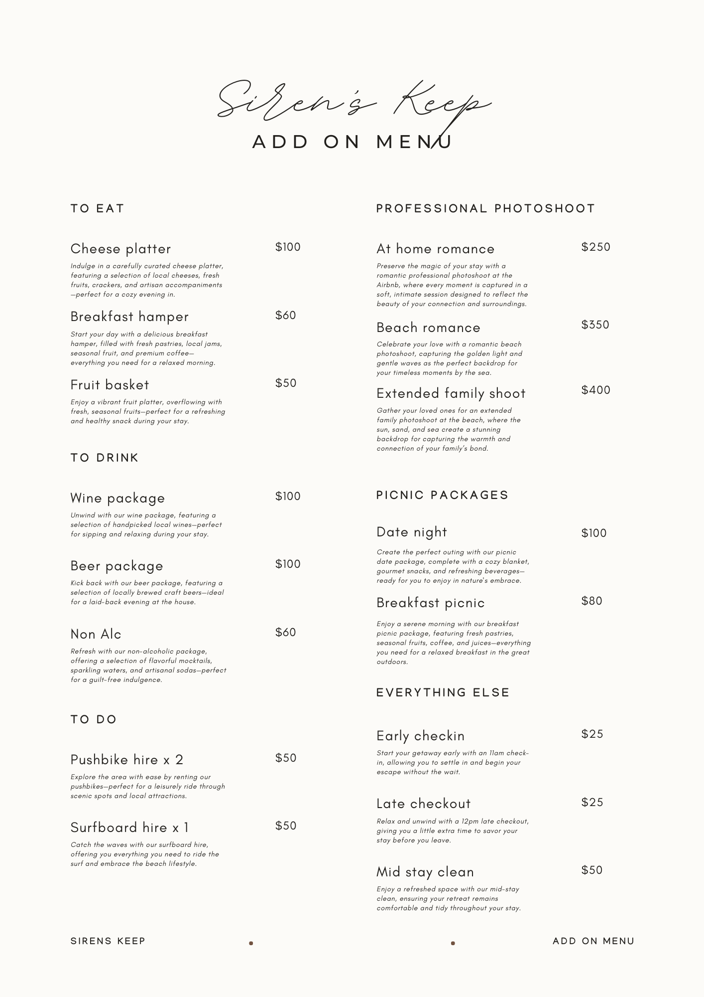 Enhance your Sunshine Coast accommodation with our curated add-ons. From breakfast hampers and cheese platters to surfboard hire and professional photoshoots, these extras are designed to make your stay at Siren’s Keep unforgettable.